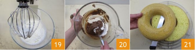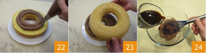 Fill the ring cake with the cream 22 creating concentric circles, then reassemble the ring cake with the other half 23. With the leftover cream, prepare the glaze by mixing it with the coffee 34.