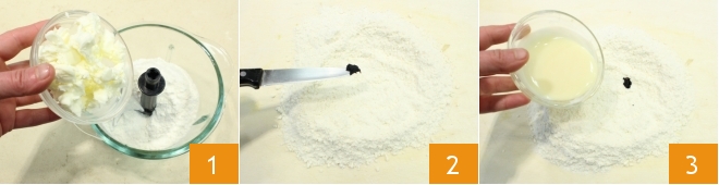 To make the Easter tart with ricotta and chocolate, start with the shortcrust pastry: pour the flour, a pinch of salt, and the butter cut into pieces, just taken out of the fridge, so it's still cold, into a mixer 1. Blend everything until you get a sandy and floury mixture and place it on a work surface. Form the classic fountain shape in the center of the mixture and add the seeds from the vanilla bean 2 and the condensed milk 3.