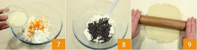 add the seeds from the vanilla bean, the orange zest, the condensed milk 7, and finally the chocolate chips 8. Mix with a spoon to combine the ingredients. Meanwhile, take the shortcrust pastry, place it on a floured work surface, and roll out a sheet about 0.4 inches thick with a diameter of 10 inches 9,