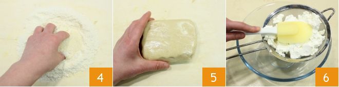 Then quickly work the mixture by hand 4 until you obtain a compact and homogeneous dough; wrap it in plastic wrap 5 and let it rest for about 30 minutes in the refrigerator or until it is firm; in the meantime, prepare the tart filling: sift the cow's ricotta through a fine-mesh sieve so that it is smooth 6 and collect it in a large bowl,