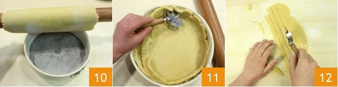 wrap the dough around the rolling pin and unroll it onto a 9.5-inch diameter mold greased and lined with parchment paper 10. Press the sheet into the mold and trim the excess edges with a pastry wheel 11. From the leftover dough, cut strips about half an inch wide 12