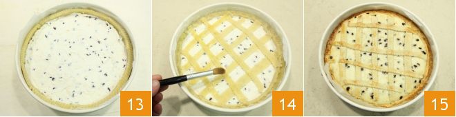 Pour the cream into the mold and level the surface with the back of a spoon 13. Arrange the strips on the surface of the tart, crisscrossing them to create a lattice pattern, brush the tart with beaten egg 14, and bake it in a preheated static oven at 350°F for 1 hour (or in a convection oven at 320°F for 50 minutes). Once baked, remove the Easter tart with ricotta and chocolate from the oven and let it cool slightly before serving 15.