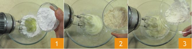 To prepare the financiers with strawberry gelée, start by melting the butter over low heat and then let it cool. Beat the egg whites with powdered sugar using an electric mixer 1. Once they become slightly frothy, add the almond flour 2 and all-purpose flour 3.