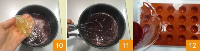 Then gently squeeze the gelatin and pour it into the saucepan 10. Stir with a whisk to completely dissolve the gelatin 11, then pour the mixture into a silicone mold with half-spheres of the same size as the pastries 12.