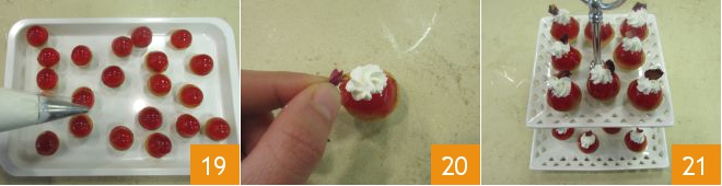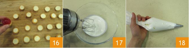 Place each gelatin sphere on top of the financiers 16. Whip the cream with well-chilled beaters and bowl 17, place it in a piping bag 18.