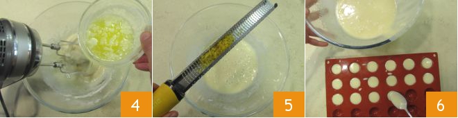 Also pour in the cooled melted butter 4 and continue to work with the beaters. Flavor with the lemon zest 5 and mix with a spatula. Pour the batter into mini sphere silicone molds using a teaspoon 7. Bake in a static oven at 350°F (rounded from 180°C) for about 20 minutes. Once ready, remove from the oven and let cool.