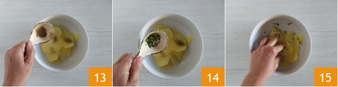After the time has passed, peel the potatoes 10 and cut them into thin slices using a mandoline or a knife 11. Place the slices in a bowl and season with 1 tbsp of olive oil 12.