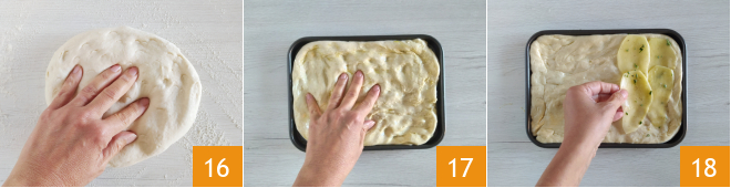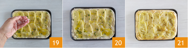 Retrieve the risen dough, work it quickly on the floured work surface by pressing it with your fingertips 16. Transfer it to a 10 x 8-inch greased baking pan and spread it out to a thickness of about one-fifth of an inch, using 1 tsp of olive oil poured on top 17. At this point, arrange the potato slices on the surface, slightly overlapping them 18.