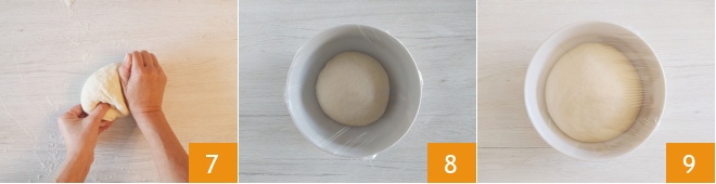 Work until you obtain a smooth dough 7. Transfer the dough ball to a bowl, cover with plastic wrap 8, and let it rest for 45 minutes, or until it doubles in volume, under a woolen blanket 9.