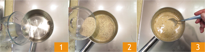 To make the white chocolate drink, heat the water in a small pot until it reaches a temperature of 185°F 1. Once the temperature is reached, pour the instant cappuccino into the water 2 and mix well. Wait about 20 seconds, mix again, and let it cool slightly 3.