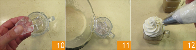 Transfer the whipped cream into a piping bag with a star tip. Assemble your white chocolate drink: in a glass, pour 5 ice cubes, the blended mixture 11, and garnish with the cream 12.