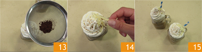 Sprinkle with coffee powder 13 and decorate with white chocolate flakes 14. The white chocolate drink is ready to be enjoyed 15.