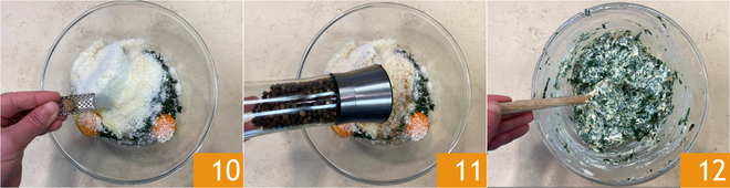 Season with nutmeg 10, salt and pepper 11. Mix well to obtain a homogeneous mixture 12. Set aside.