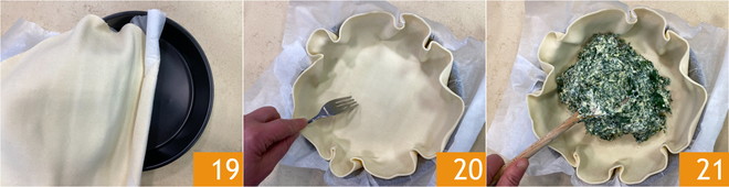 You are ready to assemble the pie: unroll the puff pastry and place it with its baking paper inside a pan with a diameter of 8 inches at the base and 9.5 inches at the top 19. Prick the base with a fork 20, then evenly distribute the green filling 21.