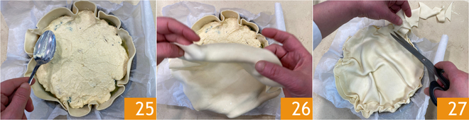 Gently level the cream 25, then cover with the second sheet of puff pastry 26 and trim the excess with a pair of scissors 27.