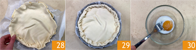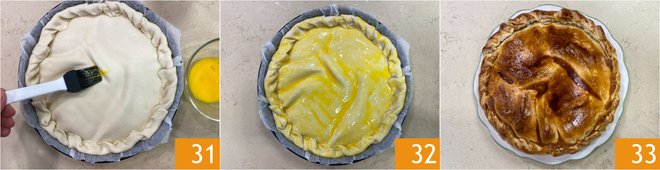 Brush the surface and edges of the pie with the mixture obtained 31. Bake in a preheated conventional oven at 392°F for about 50 minutes. Once golden, remove from the oven and let it cool slightly. Your easy pasqualina pie is ready to be served 33!