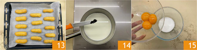Bake in a preheated static oven at 365°F for about 30 minutes. They should be light and crispy when done 13. Remove from the oven and let cool. Meanwhile, prepare the custard: heat the milk with the vanilla seeds in a saucepan 14, while in a bowl, mix sugar and egg yolks 15.