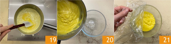 Once done, return everything to the heat 19, stirring with a spatula until it starts to thicken. Once it reaches a boil, pour the cream into a bowl and let it cool in the fridge with plastic wrap in contact 20 21.