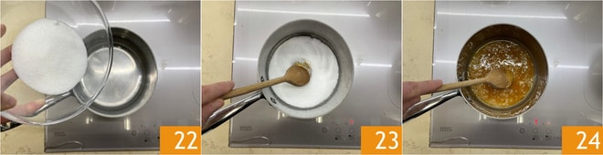 Prepare the caramel by placing sugar in a saucepan, preferably with a thick bottom 22. Turn the heat to medium-high, and as the edges begin to melt, stir 23 until the desired color is achieved 34.