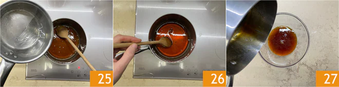 Turn off the heat and add the water, previously heated 25. The caramel will start to boil; let it finish by itself, then stir 26. Divide it into 3 parts, two portions of about 1 oz each and the third with all the remaining caramel 27. Let it cool to room temperature.