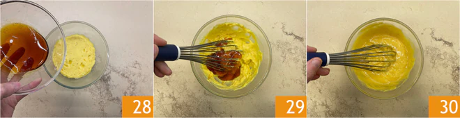 Take the cold cream and soften it with a whisk, add the larger portion of caramel 28 and mix well 29.