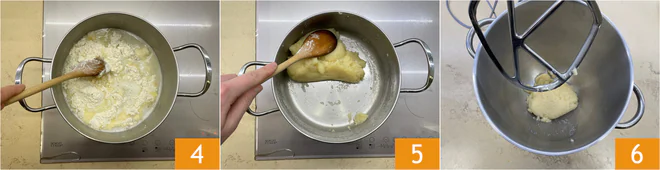 To make the éclairs, start with the choux pastry: put water, sugar 1, salt, and butter 2 in a saucepan. Bring to a boil, at which point add the flour all at once, stirring quickly with a wooden spoon 3.