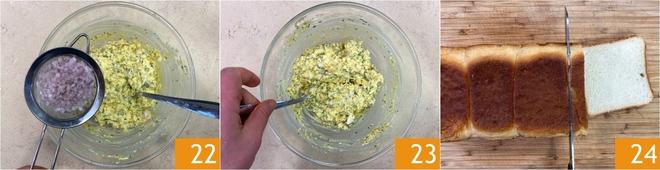 Finally, add the drained chopped shallot 22 and mix again to combine 23. You are ready to assemble your sandwich: cut 8 slices of sandwich bread 34 and remove the crust.