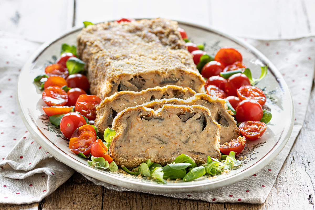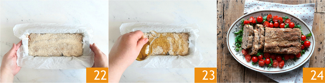 Place the loaf in a large loaf pan (11.8 x 5.9 in) lined with parchment paper (or lay it inside a baking tray or sheet pan, also lined with parchment paper). Finish with a generous drizzle of extra virgin olive oil on the surface 23. Bake in a preheated oven at 356°F (conventional mode) for about 45-50 minutes, letting it brown for 2-3 minutes at the end of cooking. Remove from the oven and let it cool thoroughly before removing it from the pan and plating. Serve the eggplant loaf with lamb's lettuce and cherry tomatoes 34.