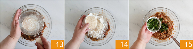 Also incorporate the cornstarch and sifted flour 13, the breadcrumbs 14 and mix everything very well. Finally add the basil leaves torn by hand 15 and mix once more.