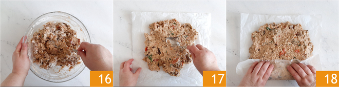 Press well 19 then remove the parchment paper 20 and generously coat the loaf on both sides with breadcrumbs 21. To turn it, simply roll it over itself.
