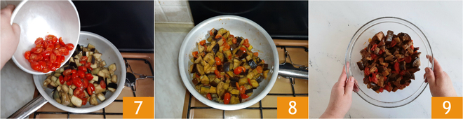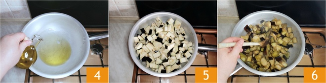 In a skillet pour a generous drizzle of extra virgin olive oil 4, then add the eggplants 5, stir 6 and cook them until softened.