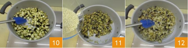 stir 10, and cook them for about 4 minutes, still on low heat. Then add the rice 11, stirring well to toast it along with the eggplants 12.