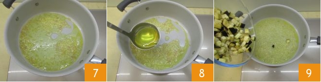 Sauté the shallot over low heat for 4-5 minutes, 7 stirring occasionally to prevent sticking. Then deglaze with a ladle of boiling broth 8 and let your sauté cook for another 10 minutes. After this time, add the diced eggplants 9