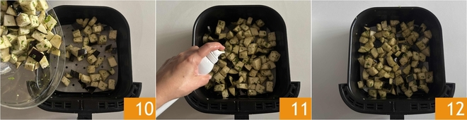 Then arrange the eggplants in the air fryer basket, you can use parchment paper, but only if you have the perforated kind 10, otherwise, you can skip it. (We used a fryer with a 6.5-liter capacity). Once the eggplants are placed inside the basket, spray some oil or drizzle some oil over them 11 12.