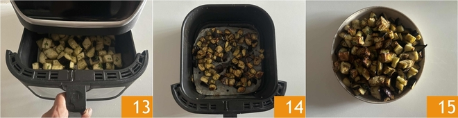 Then cook the eggplants at 392°F for about 15 minutes, making sure to check them halfway through the cooking process 13 and stir if necessary. The times may vary slightly depending on the fryer and the size of the eggplants, assess the browning, and once browned, they will be ready 14. Transfer to a small bowl and serve your eggplants in the air fryer 15.