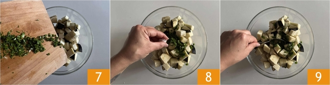 Pour the freshly prepared mixture into the bowl with the eggplants 7. Then add a pinch of salt 8 and mix everything well inside the bowl 9.