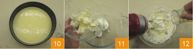 The batter is ready for baking 10: bake in a static oven, preheated to 350°F for 30 minutes. Meanwhile, prepare the frosting: in a bowl, pour the cream cheese and softened butter (just take it out of the fridge fifteen minutes before use) 11, beat with electric beaters, and pour in the elderflower syrup 12.