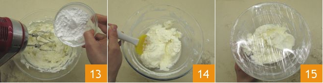 Once the syrup is absorbed, add the powdered sugar 13. You will obtain a thick cream 14, cover it with plastic wrap 15, and let it rest in the fridge for at least thirty minutes.