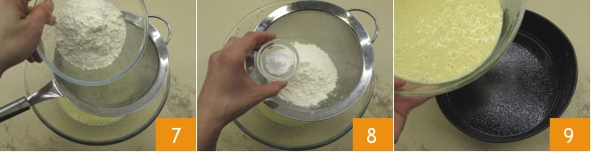 At this point, add the sifted dry ingredients: first the flour 7 and then the baking powder 8. Mix with a spatula and then pour the batter into a greased 9-inch round pan 9.