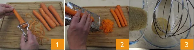 To make the English carrot cake, start by preparing the carrots: peel them 1 and finely grate them 2, you will need to obtain 330 g. Then pour the brown sugar into the bowl of a stand mixer with beaters 3,
