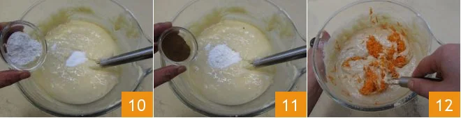 the baking powder 10, the cinnamon powder 11 and gently mix to combine the dry ingredients. Also add the carrots and fold them into the batter 12.