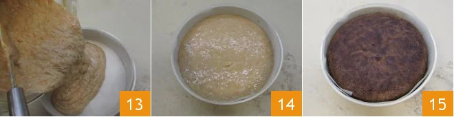 Transfer the batter into a 28 cm cake pan, previously lined with parchment paper (13-14) and bake in a preheated static oven at 350°F for 50 minutes. Then cover the cake with aluminum foil and bake for another 15 minutes, so the cake's surface won't darken excessively (if using a fan-forced oven, bake at 320°F for 45 minutes). After the baking time, remove your carrot cake from the oven 15 and let it cool.