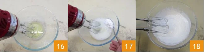 Only when the cake has completely cooled, proceed to make the frosting. Start whipping the egg whites 16 (with the leftover yolks you could prepare a delicious Pastry cream) and gradually add the powdered sugar 17, until you get a smooth and lump-free frosting 18.