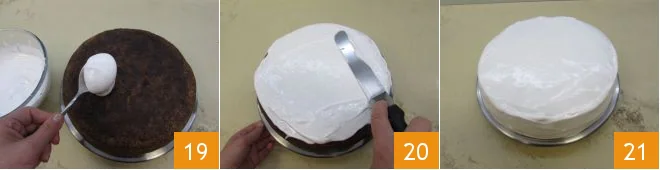 Remove the carrot cake from its pan and place it on a serving dish. Then, using a spoon, spread the frosting on the cake 19 and use a spatula 20 to cover the entire surface smoothly 21.