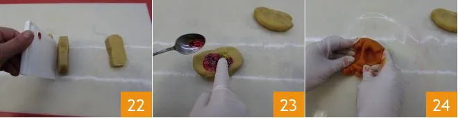 While the frosting dries, make the sugarpaste carrots. Divide the marzipan into 2 parts 22, one of 50 g and one of 20 g. Take the larger part and color it by adding a drop of yellow and a drop of red color 23. By kneading with your hands (use gloves to prevent staining) you will get a lively orange color 34.