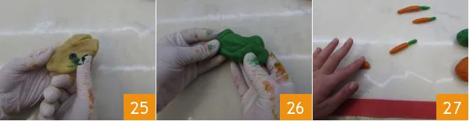 Take the smaller part of marzipan and color it by adding 1 drop of green food coloring 25 and kneading it with your hands 26 until you get a uniform color. At this point, form the carrots using 5 grams of orange marzipan for each piece. Use your fingers to shape each marzipan piece into a tapered shape similar to carrots 27.