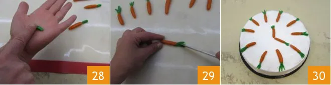 Then divide the green part into pieces of about 2 grams and by modeling with your fingers, you should obtain the carrot tops. Then join the two parts 28, carrot and top, and using a small knife, divide the green part into 3 small strands 29. Once you've finished all the little carrots, use them to decorate your carrot cake 30!