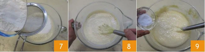 Then stop the mixer, add the sifted flour directly into the bowl 7 and gently mix with a hand whisk 8, without deflating the mixture. Then add the baking soda 9,