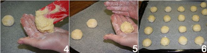 Flour your hands and take a bit of dough with a spoon or spatula 4 with which you will form balls the size of a large walnut (about 0.9 oz each)5 that you will place on a baking tray lined with parchment paper, spacing them a few inches apart. Proceed this way until the dough is used up (about 28-30 balls)6.