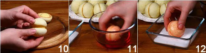 Bake the obtained balls in a preheated oven at 355°F for about 15-20 minutes. The dough, which should not color while baking, 7 will create about 30 hemispheres. Meanwhile, prepare the custard (see recipe by clicking Pastry cream) and let it cool. When the hemispheres are cooked, remove them from the oven and let them cool, then take a teaspoon and slightly hollow out the center of the flat side of each piece 8 to obtain a small cavity. Put the custard into a pastry bag with a smooth nozzle and squeeze it into the small cavity in the center of each hemisphere 9;